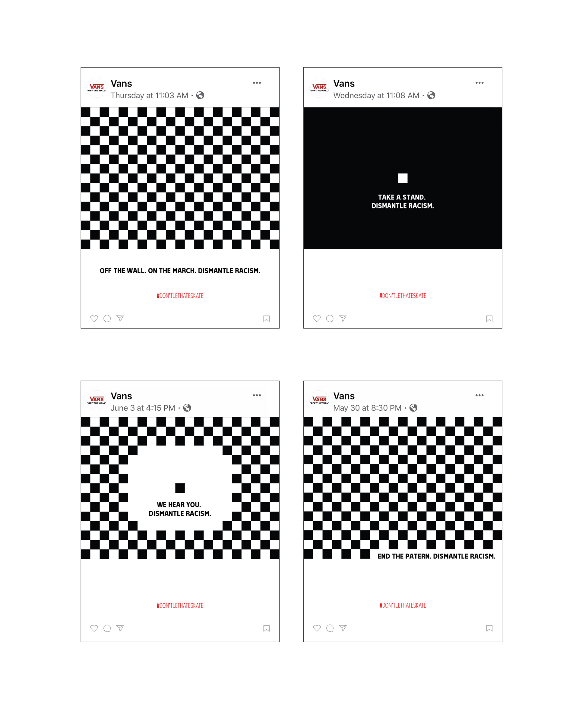 Using imagery taken during the 2020 demonstrations, crafted image ads and developed a branded element using the iconic Vans skateboard logo and checkered pattern to communicate the message of not letting hate skate. This simple yet effective graphic element was used as the headline treatment to allow for the images to speak loudly to the audience. The hashtag #dontlethateskate was the only copy element used throughout all executions.